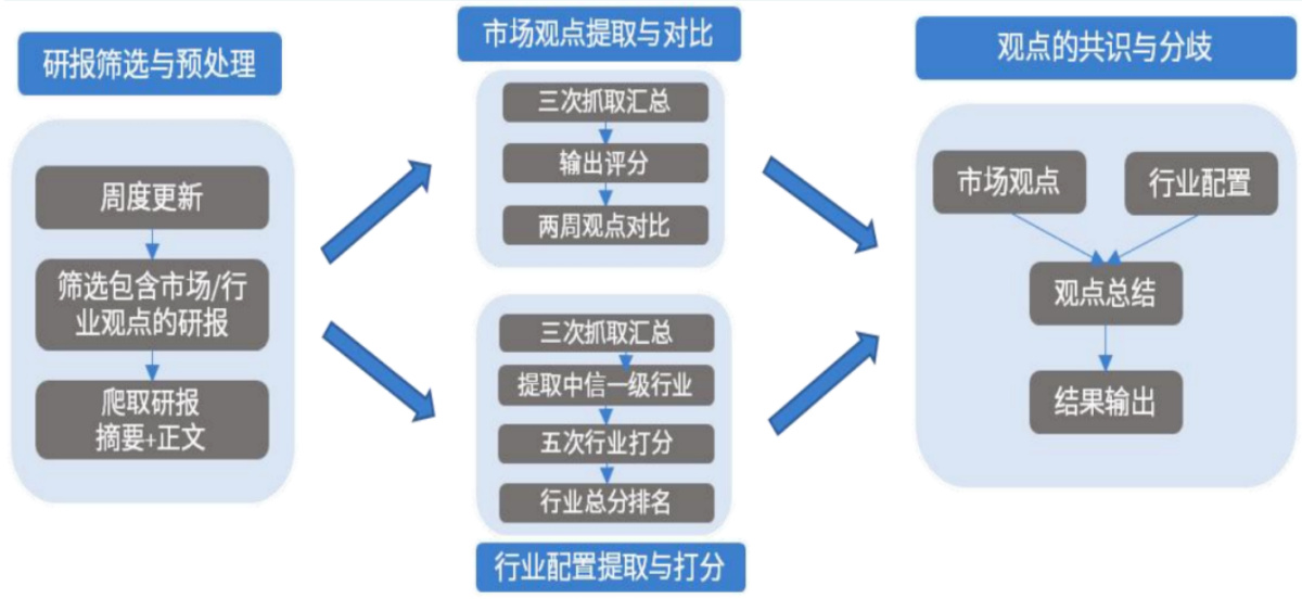 - 研报预处理至观点提取和分类均采用多轮提示词引导大语言模型自动完成,实现市场与行业观点快速汇总。
