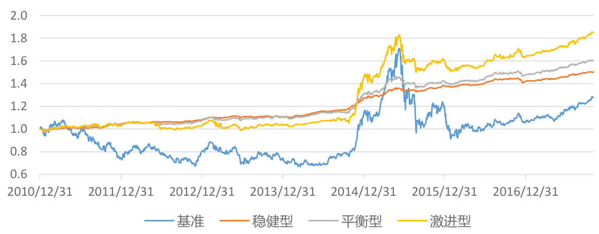- 2011-2013年基准表现较弱;三种策略收益稳定上升,尤其激进型明显优于其他两个组合