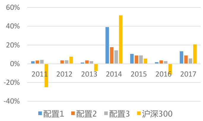 - 描述:2011-2017年历年收益率对比,蓝色为激进型,橙色平衡型,灰色稳健型,黄色沪深300