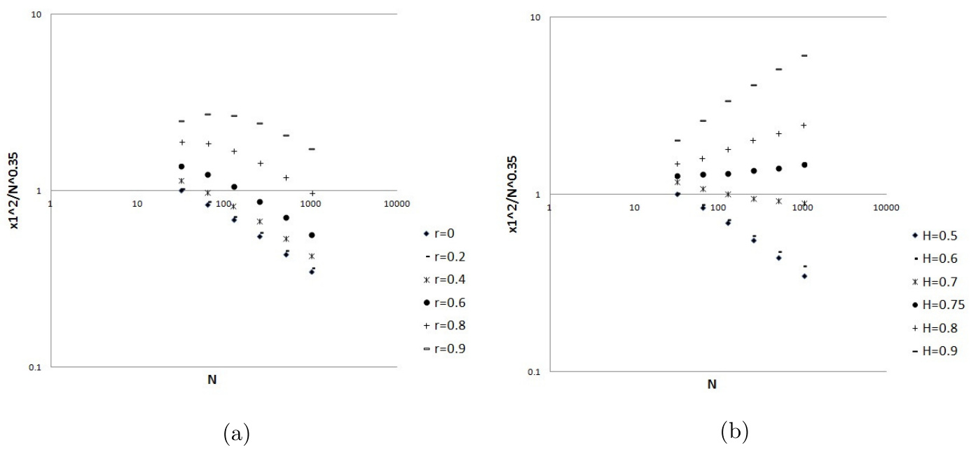 - (b) fBm中,不同$H$展示两种趋势,小于临界$Hc$时类似于(a),大于$Hc$时最大特征值显著增长趋向无限。
