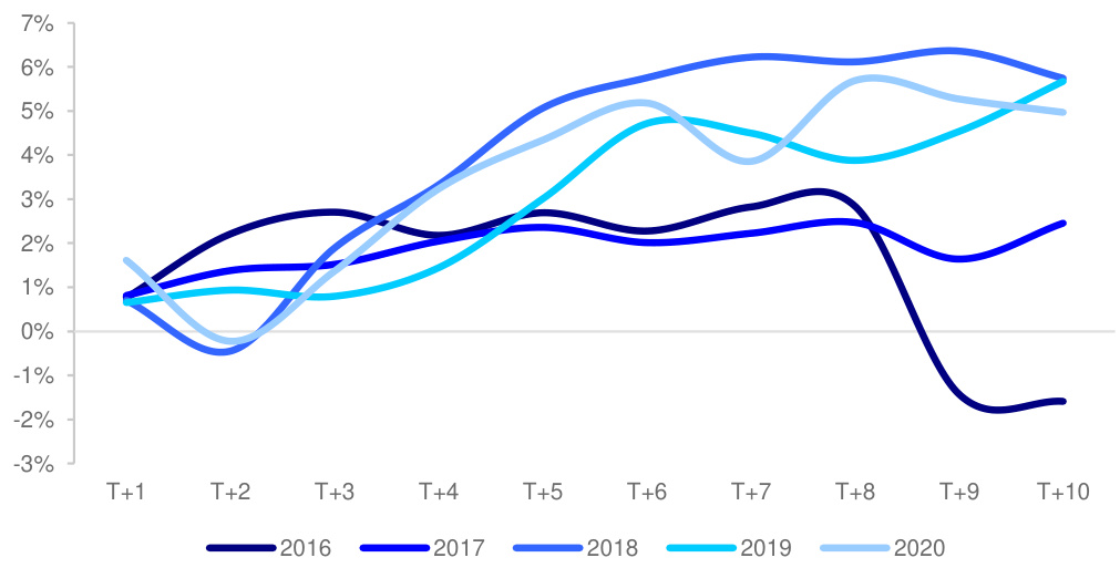 - 春节后买入中证500卖空上证50,5日、10日持有平均收益率分别为3.37%、5.17%,且胜率极高;