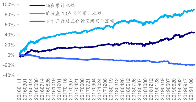 - 日内收益在不同股指期货合约(IF、IH、IC)均有类似区间收益变化,隔夜走强,上午增长,下午盘初反弹后回落。