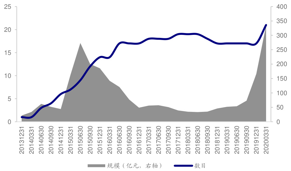 - 公募对冲产品自2013年起发展,2015年及2019年后规模明显回升,2020Q1行业规模334亿元。
