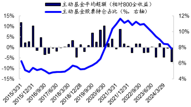 - 描述:柱状图表示每年主动基金超额收益均值,折线为万得全A指数走势。