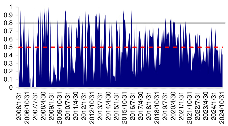- 解读:2017年前数月多次超过80%,2017年后大幅波动,且多数月份不足50%,2023年后更低,反映主动基金跑赢基准资金比例显著下降。