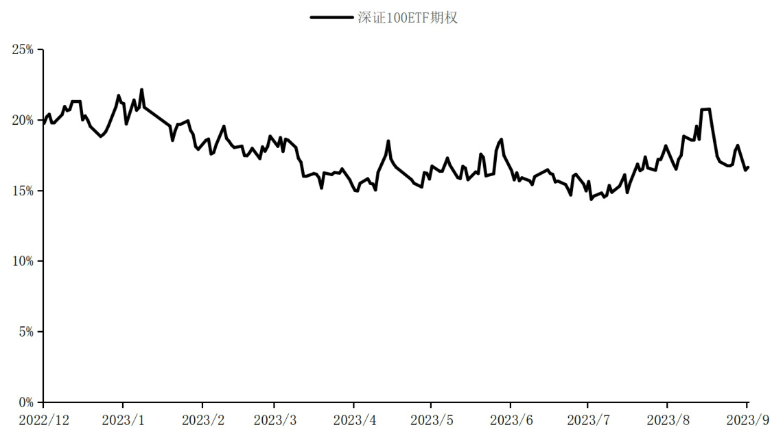 - 9月12日数据,深证100ETF期权近月平值合约隐含波动率16.64%,处于历史41.3%分位数,水平较低。