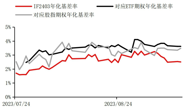 - 沪深300:IF2312与IF2403两期限合约基差趋势类似,也体现ETF期权略高于期货基差。