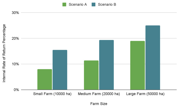 - IRR随农场规模和土地施用扩展提升,大型B情景最高达25%。