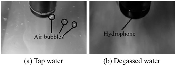 - 描述:(a)自来水中可见大气泡明显,(b)脱气水中无肉眼可见气泡。