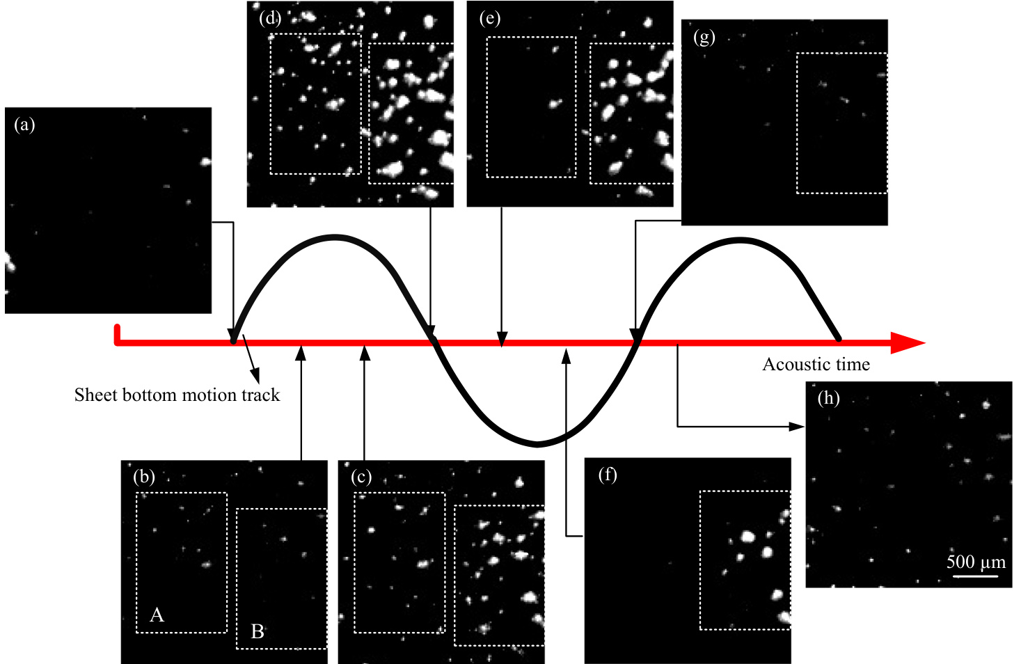 - 低功率仅有少量微小气泡,高功率则气泡分布扩展,体积增大,空化云产生频率提高,呼应声压幅度的增强。