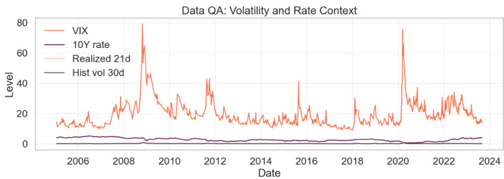 - 关键特征:ATM IV(30d/91d)、IV 斜率(iv91d - iv30d)、25-delta put/call(用于计算 skew)、VIX、10Y 利率、rv21d、hvol30d/91d;前向收益 retfwd 与动作时间对齐,避免前视泄漏 [page::2].