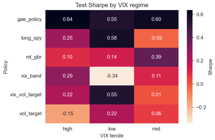 - Figure 3(按 VIX tercile 的 Sharpe 热图):展示 GAE 在高波动率桶表现最好(比如 high: 0.64),而 long