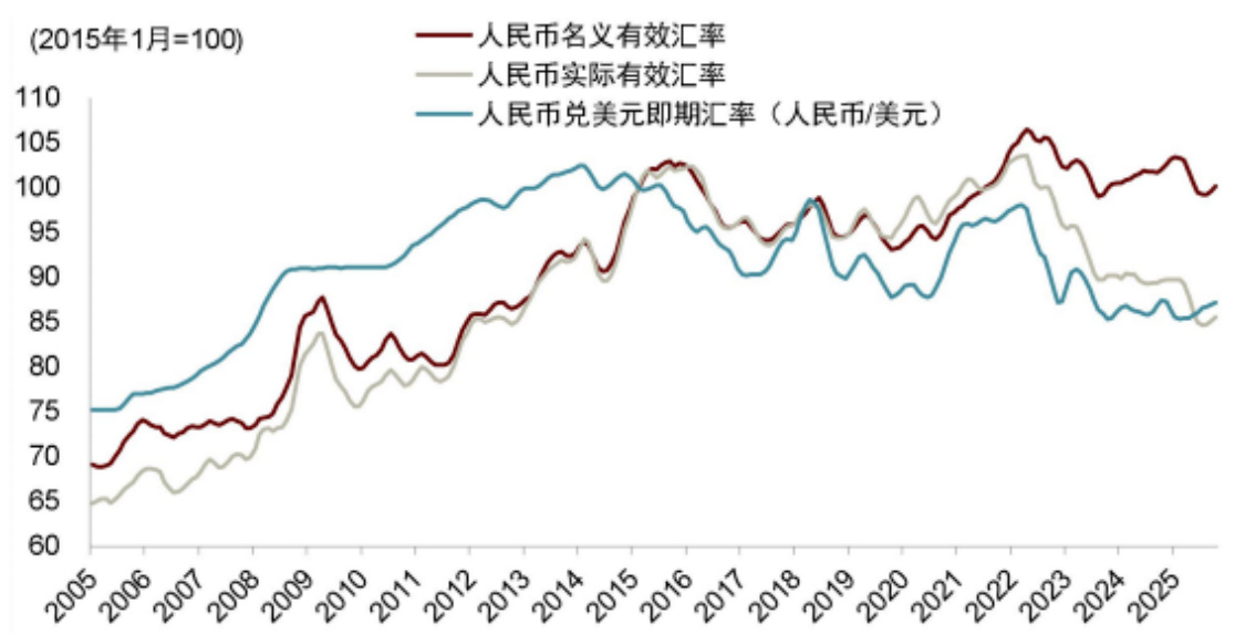 - 图表显示:2005-2025年名义有效汇率、实际有效汇率和对美元即期汇率变动趋势(以2015年1月=100为基点),2022-2025年人民币实际有效汇率总体走弱,累计约贬值约16%(报告引用BIS及iFinD数据) [page::4]