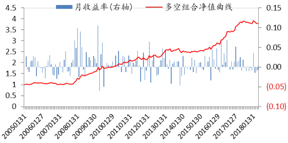 - 描述:曲线显示2005-2018年间,采用EPSQ因子构建的多空组合净值持续攀升,月度收益波动较为温和。