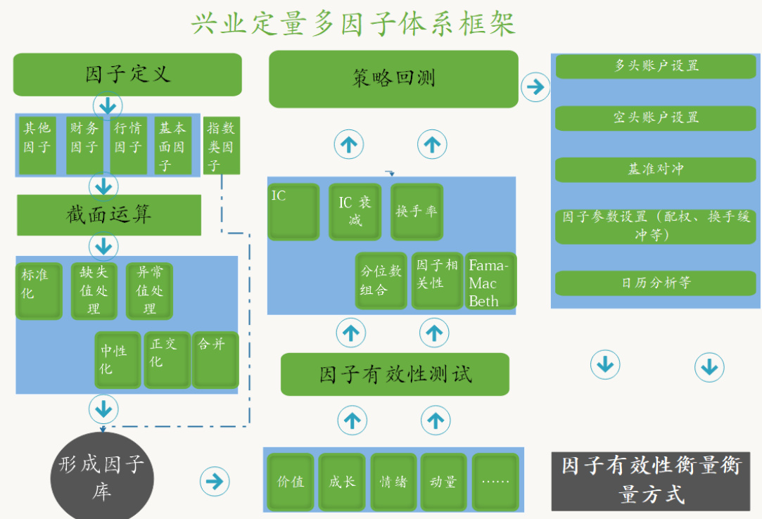 图表5展示了多因子体系整体框架,囊括因子定义、截面运算、因子标准化处理、有效性测试和策略回测模块,体现了体系的完整性。