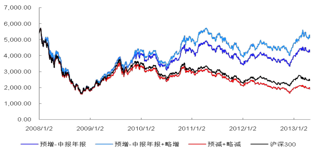 - 描述:图1为2008年至2013年的累计策略净值走势,蓝线(含预增+略增)明显高于沪深300基准指标红线;图2为该策略相对沪深300的优势指数,显示策略优势逐年扩大。