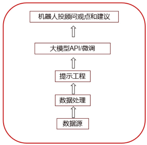 - 展示机器人投资顾问的流程逻辑,从数据采集、处理、提示工程、大模型调用到生成投资观点和建议。