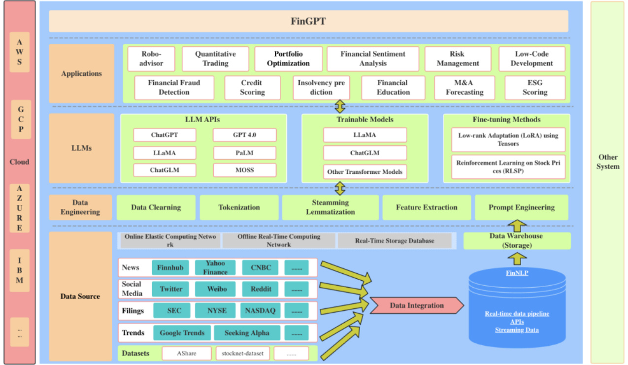 - 该架构体现了FinGPT从海量异构数据到具体投资决策的多层次纵深设计,强调数据驱动和技术融合的重要性。[page::3]