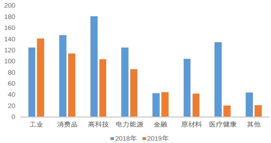 图2:海外并购交易各行业金额对比(2018 vs. 2019)