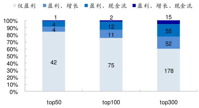 - 因此,盈利、增长、现金流三因子兼优的个股极少,top100集交集平均仅2只,top300约15只,占比约2%。