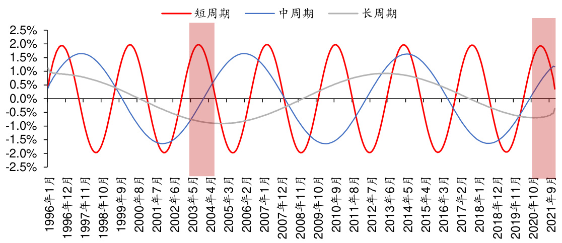 - 设定42个月(基钦周期)、100个月、中长周期200个月为研究对象,利用三周期滤波技术分析资产价格及经济指标规律。