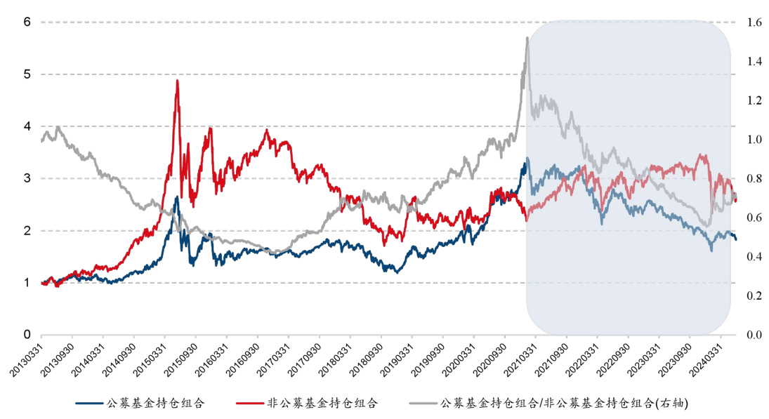 - 展现2013-2024年公募持仓和非公募持仓的相对表现及其轮动关系。