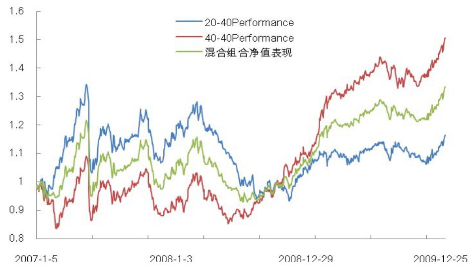 - 展示将资金平均分配于20日与40日采样组合的净值走势,该混合策略相较单一采样期组合提供了更平稳的收益曲线,降低投资波动和下行风险。