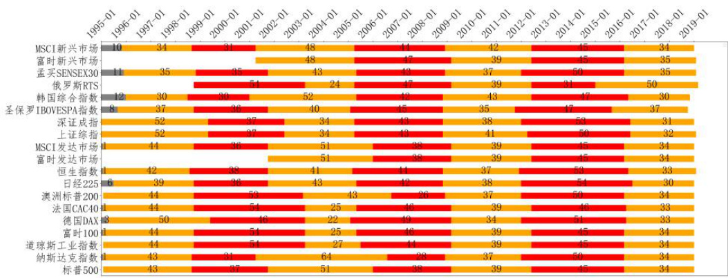报告样本覆盖全球主要成熟市场(如标普500,富时100,德国DAX,日本日经225等)及新兴市场(如中国上证综指、深证成指、巴西IBOVESPA、韩国综合指数等)的股票指数。报告选取1995年起数据,依据上述极值点定量识别法划分周期起止,结果显示: