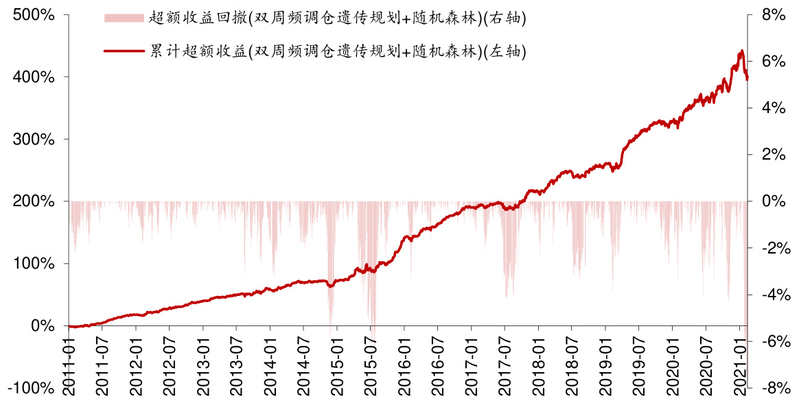 - 双周调仓遗传规划+随机森林模型2021年累计超额收益近期略显回调,最近一年收益率-3.7%,2011年回测以来年化超额收益17.76%,信息比率2.66。