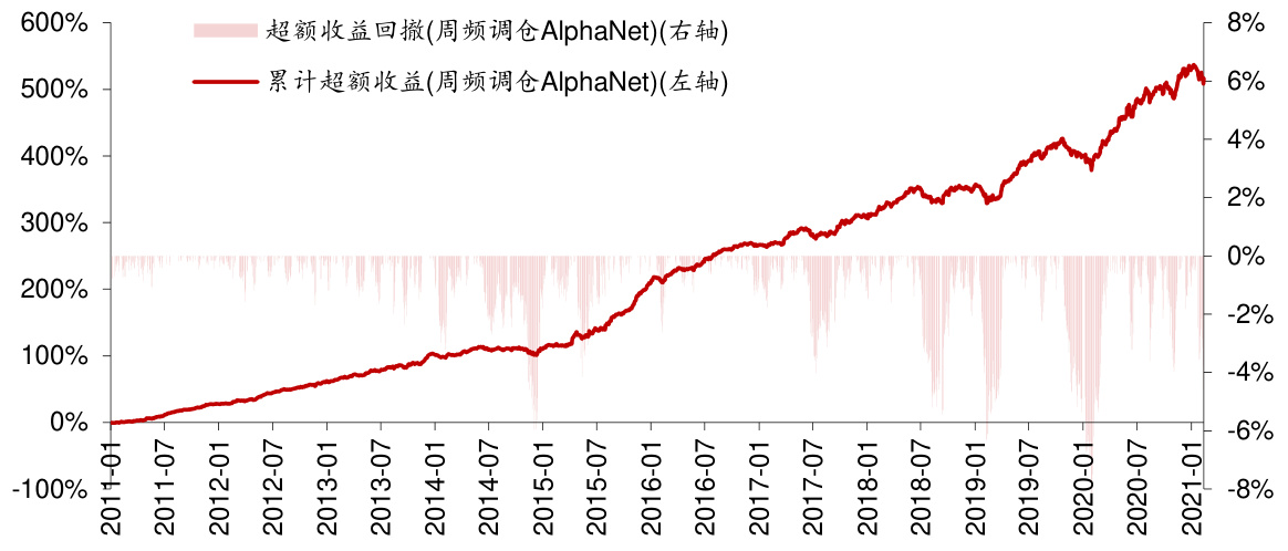 - 最近一年AlphaNet周频调仓相对中证500超额收益为25.71%,2011年回测以来年化超额收益率20.3%,信息比率3.28,Calmar比率2.23。