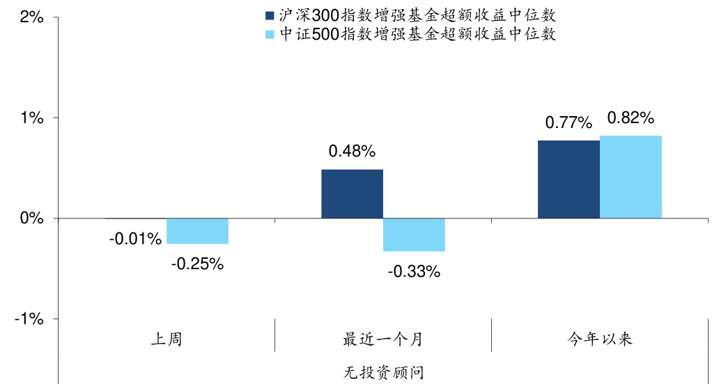 - 同期中证500指数增强基金上周表现略逊于沪深300基金,为0.46%,但今年以来累计超额收益达到1.68%,明显优于沪深300基金。