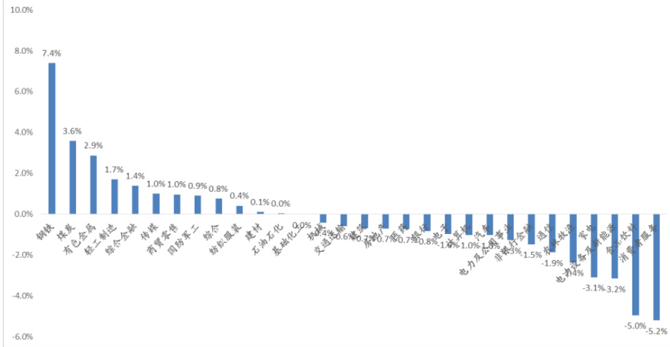 - 钢铁行业涨幅领先7.4%,消费者服务和食品饮料行业跌幅显著。
