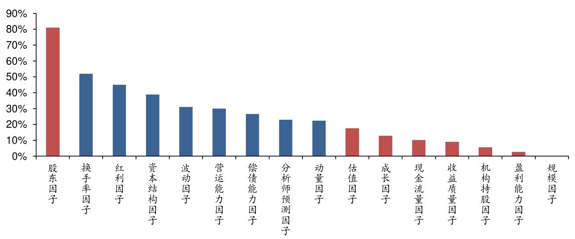 - 高显著因子包含年涨跌幅(动量因子)、户均持股比例增长率(股东因子)、扣非净利润与净利润比率(收益质量因子)、现金流量净额增长率(成长因子)等。