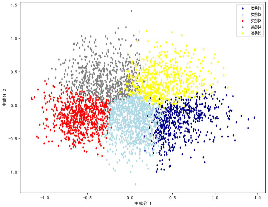 - 使用16大类合成因子对基金进行KMeans聚类,设置五类,运用PCA降至二维用于可视化,轮廓系数0.17说明聚类效果较好,样本内部相似度高、类别间差异明显。