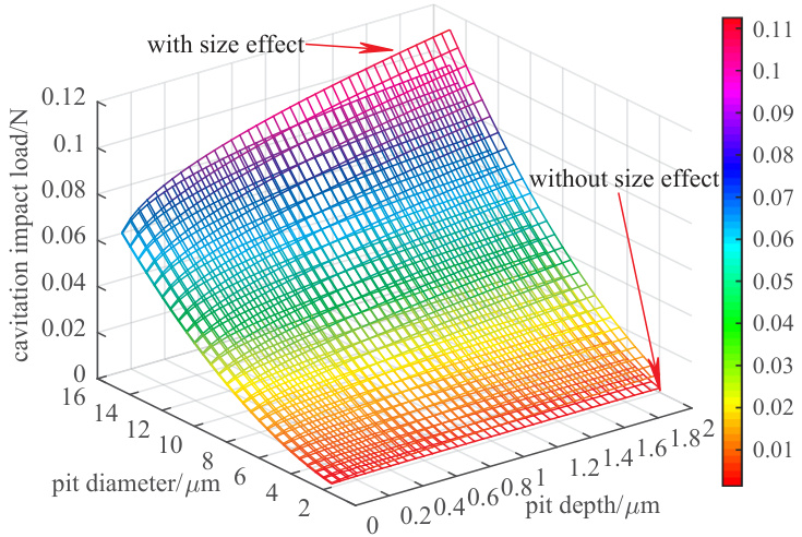 - 图 1(cavitation impact load under different pit sizes)呈三维曲面,横轴为坑直径 dp(2–15 μm)、纵轴为坑深 hp(0–2 μm),纵向高度为冲击载荷 Lp;图中标注“with size effect”和“without size effect”两表面,显示考虑尺寸效应后 Lp 整体提高且随 dp、hp 增大而增大,dp 对 Lp 的影响强于 hp,对应最大值约 0.1125 N(有尺寸效应)与 0.09719 N(无尺寸效应),增幅约 15.75%[page::3].