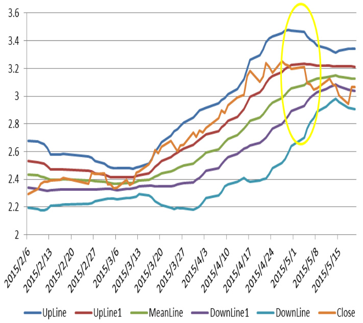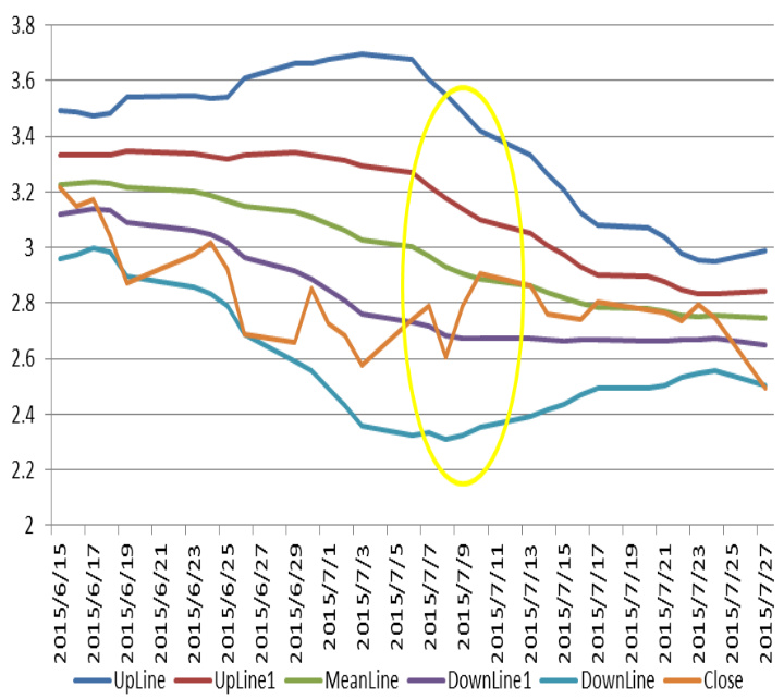 - 图7展示包含新窄幅布林带(UpLine1、DownLine1)股价通道的时间序列,能更灵敏捕捉价格波动区间。