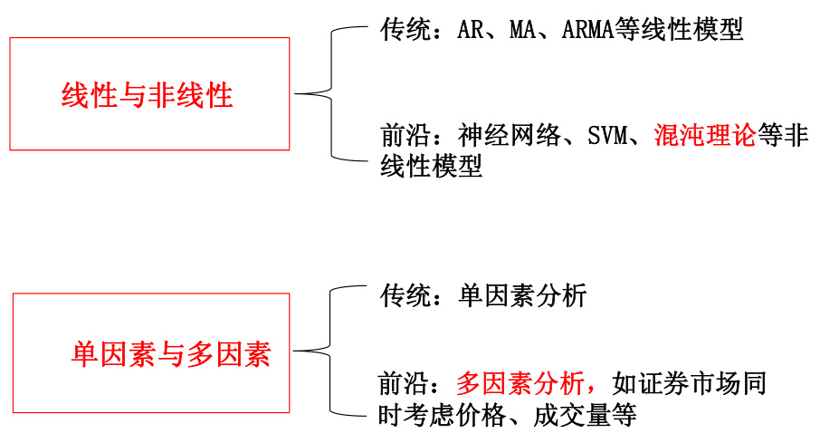 - 展示了时间序列预测领域由传统线性模型(如AR、MA、ARMA)向非线性模型(神经网络、SVM、混沌理论)进展的趋势。