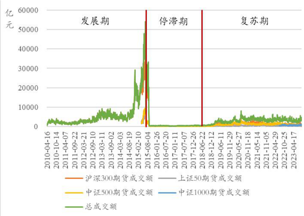 - 描述:显示2010年至2023年间主要股指期货(沪深300、上证50、中证500、中证1000)成交额发展与三个市场阶段(发展期、停滞期、复苏期)。