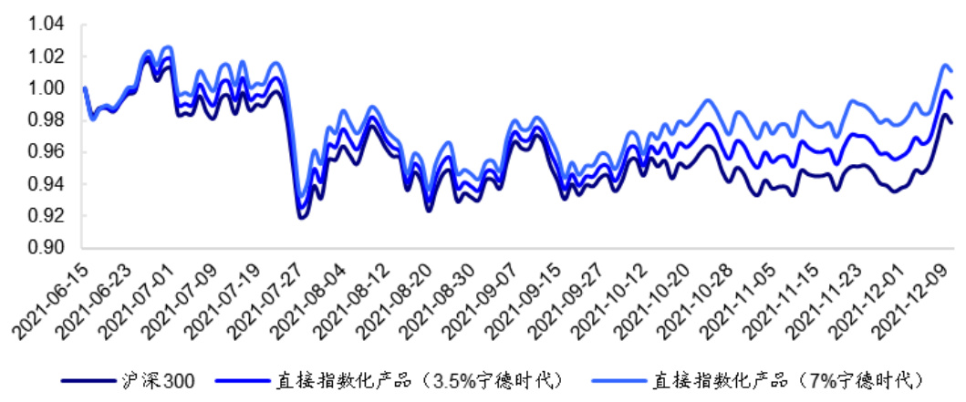 - 描述:图2展示了2021年6月15日至12月10日三个组合净值走势:沪深300基准(深蓝),含3.5%宁德时代(蓝色),含7%宁德时代(浅蓝)。