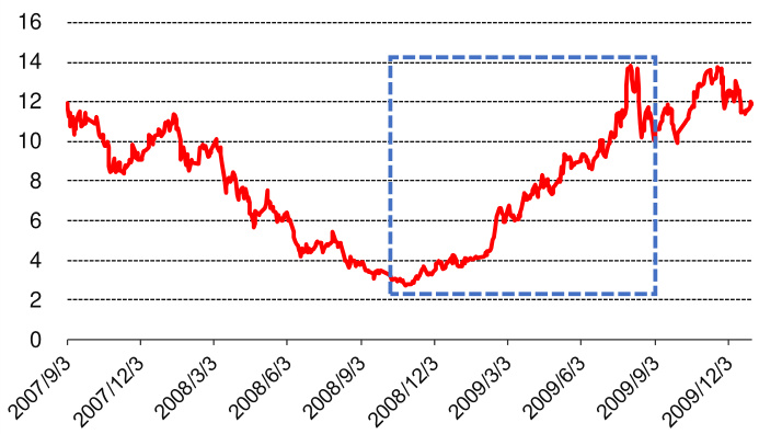 - 图1郴电国际股价走势:2008年10月前下跌近75%,随后9个月内反弹近400%,表明技术形态深跌后的强劲反弹潜力。