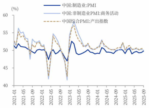 图表 1:中国制造业PMI及相关指数(2021年初至2025年9月)
