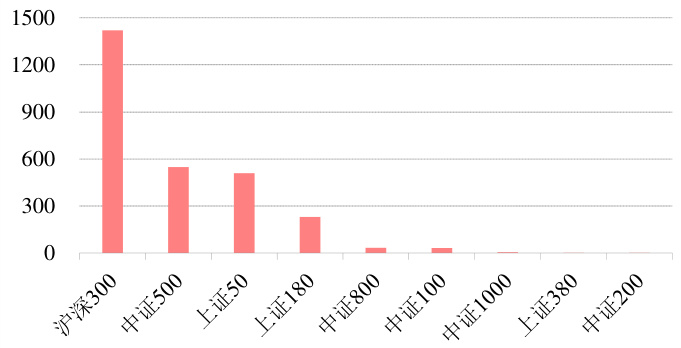- 展示沪深300的跟踪规模最高(约1421亿元),其次中证500和上证50,整体规模分布不均,且中证1000及中证200等指数规模极小,表明市场关注度集中在头部大型指数。