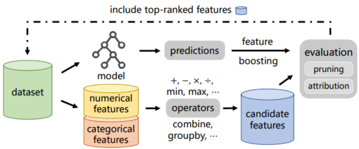 - 描述:数据流图示从基础数据集出发,结合运营特征和算子集合,生成候选特征并通过模型预测和评价进行筛选。