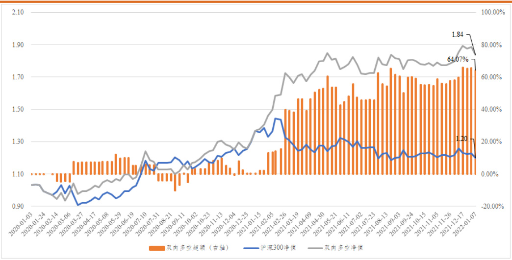 - 双向多空策略累计收益83.97%,期末净值1.84,超额收益64.07%,最大回撤11.10%。