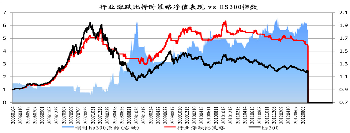 图6(页8):基于行业涨跌比的大盘择时策略净值走势vs HS300