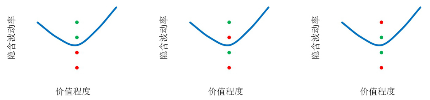 - 描述: 三图分别表示三类典型的买卖价隐含波动率分布情形,红点绿点代表看涨、看跌的买一和卖一隐含波动率。