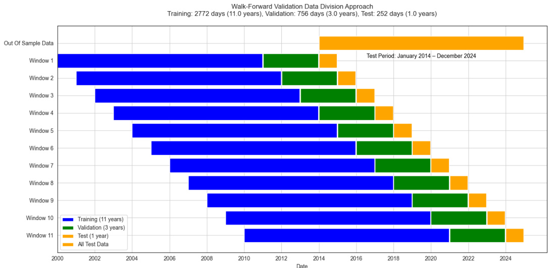 - 滚动窗口:每窗包含11年训练、3年验证、1年测试;窗口逐年前移,共11个重叠窗口,最终汇总2000–2025期间的预测 [page::8].