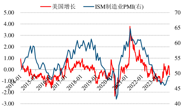 - 美国增长因子当前值为-0.47,过去四周显著下行0.82,主因权益和国债市场影响(图表2、3)。ISM制造业PMI与增长因子相关系数为0.62,验证增长因子的构造有效性。