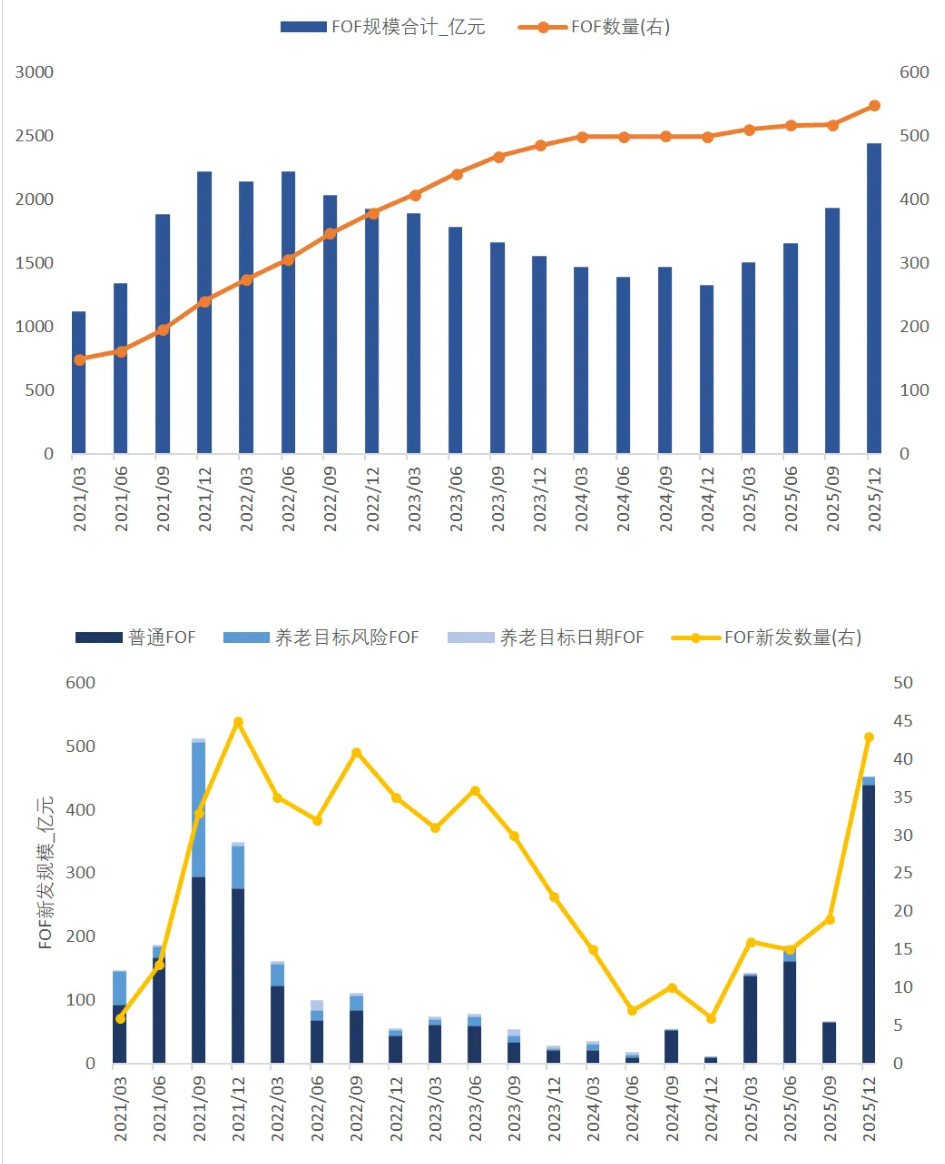 - 描述:上部为双轴图,左轴为 FOF 规模合计(单位:亿元,蓝色柱),右轴为 FOF 数量(橙色折线),时间从 2021/03 至 2025/12。图中蓝色柱在 2021–2022 年间上升到 ~2,200 亿附近,2023 年出现回落并在 2024 年底至 2025 年再次上升,在 2025/12 达到近 2,500 亿左右。橙色折线(FOF 数量)自 2021 年逐步上升,从约 150 只增长到 2025 年末接近 550 只左右。该视觉展示直接佐证了“产品数量持续增加”和“规模在 2025 年显著扩张”的结论。[page::0]