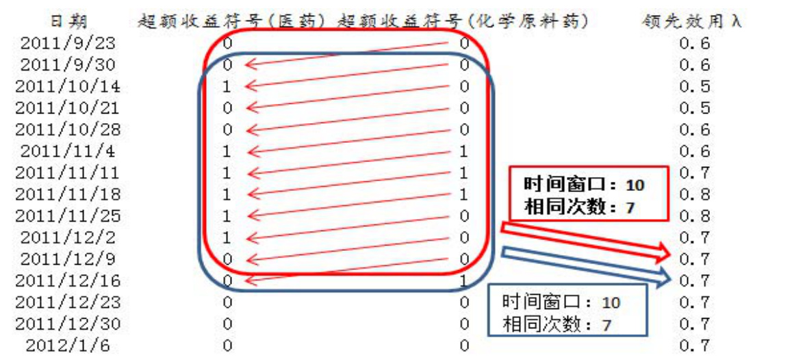 - 定义领先效用$\lambda=\frac{n}{k}$为在滑动时间窗口$k$内“符号错位比较”相等次数占比$n$,当$\lambda > 0.5$判定该子行业为“领头羊”候选。